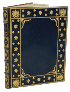 Paris, Léon Vanier, 1882. In-8, maroquin bleu nuit, large encadrement doré sur les plats orné de fers aux motifs allégoriques militaires, dos orné de même, bordure intérieure de maroquin bleu ornée de même, doublure et gardes de soie tricolore (bleu, blanc, rouge), tête dorée, non rogné, couverture (Thierry sr de Petit-Simier).Édition originale illustrée de dessins humoristiques d'Henri de Sta. Chaque feuillet est monté sur onglet.
