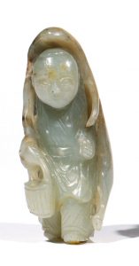 Statuette en jade céladon veiné de rouille représentant un personnage vêtu d'une peau de daim.