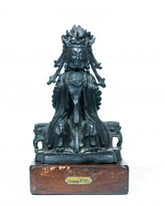 Statuette en bronze de patine brune représentant l'Auguste de jade assis en majesté sur son trone.