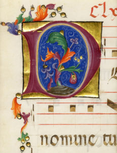 Porzione di foglio di antifonario (215x173 mm) con D miniata (100x100 mm) a motivo floreale su fondo oro.