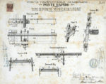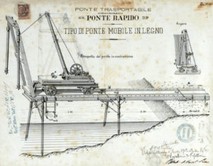 PROGETTO PROSPETTICO di ponte mobile, a china, acquerellato a colori — con dettagli e sezioni.