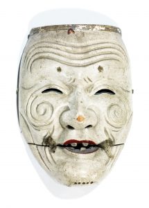 Masque de théâtre Nó, en bois laqué ivoire, représentant Kushiki-jo, un des personnages de la forme théatrâle Okina, un viellard souriant, au visage ridé, à la machoire inférieures mobile, le menton pourvu de trous pour acceuillir les...