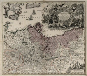 - 2) Marchia sive Electoratus Brandenburgicus nec non Ducatus Pomeraniae : cum magna Maris Balthici et provinciarum adnexarum parte...Mappa della storica regione nucleo originario dello stato prussiano unita al ducato di Pomerania e alle province baltiche. Grande e bellissimo cartiglio decorato per il titolo in alto a sinistra, in basso le scale entro piccolo cartiglio rococò con putti.