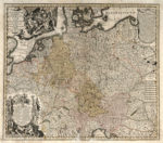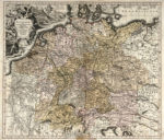 - 6) Trevirensis Archi-Episcopatus et Electoratus juxta omnes suas Praefecturas cum confini tractu Eyfaliae...Carta dell'arcivescovado di Treviri, ornata da cartiglio decorativo allegorico in basso al centro con scala e tabella esplicativa. Mappa dettagliata della parte occidentale della Renania Palatinato, con l'area lungo il fiume Mosella, e il Reno da Bonn a Oppenheim nel sud. Con confini politici delineati e i nomi di molti piccoli ducati, luoghi, montagne, boschi e fiumi.
