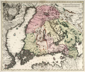 - 4) Tobias Conrad Lotter. Magni Ducatus Finlandiae Russiae partim, partim Sueciae subjeci; Sinus item Bothnici ac Finnici nove et accurata delineatio Calamo et sumtibus... La mappa illustra la parte inferiore della Finlandia, dove la nazione tocca il Golfo di Botnia e il Golfo di Finlandia. Comprende parte della Svezia occidentale, la costa settentrionale dell'attuale Estonia e una parte della Russia. Bello il dettaglio del terreno montuoso e della rete di corsi d'acqua, vengono identificati molti paesi e città.