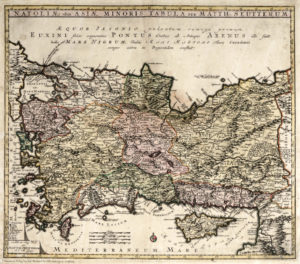 - 2) Natoliae, olim Asiae Minoris Tabula...Mappa dell'Asia Minore e dintorni con Cipro, pubblicata per la prima volta da Seutter nel 1730 circa, qui nell'edizione dopo che Probst acquistò le tavole di Seutter dal suo successore, Conrad Tobias Lotter. La carta offre un'immagine straordinariamente dettagliata, con montagne, fiumi, città, strade, isole. (2)