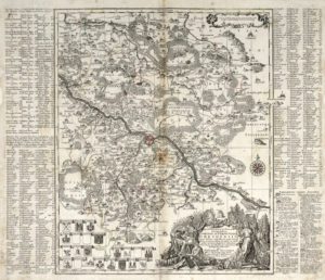 - 1) Accuratissima Delineatio Geographica Dioecesis ac Praefecturae Dresdensis cujus urbes, oppida et pagi, loca item contermina, et quae in singulis notatu digniora videntur exactiori methodo geometrice designata sistuntur... in basso a destra il cartiglio del titolo con allegorie sulla caccia, la viticoltura, e la prosperità, in basso a sinistra stemmi delle aree associate (tra cui Bischofswerda, Kamenz, Dippoldiswalde, Dohna, Radeberg, Stolpen). Cartiglio con scala e indirizzo dell'editore in alto a destra. Legende esplicative ai lati.