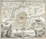 - 2) Johann Baptist Homann. Abbildung der Keys. freyen-Reichs Wahl und Handelstatt Franckfurt am Mayn mit ihrem gebiet und gräntzen vorgestelt, 1724. Francoforte sul Meno. In basso sul primo piano da sinistra Mercurio e allegoria del fiume con alle spalle una scena di mercato, al centro la veduta della città sul Meno, a destra ancora due figure allegoriche e una veduta interna della cattedrale con la cerimonia dell'incoronazione. La mappa mostra l'area intorno a Francoforte da Hoechst a Hanau. (2)