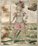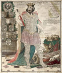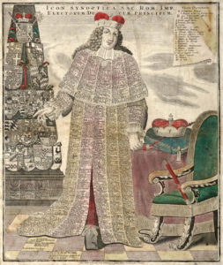 - 3) Questa curiosa immagine mostra un re, fiancheggiato da un lato da corone, scettri, armi strumenti musicali, e dall'altro da stemmi. Sul suo corpo e sulla sua armatura sono elencati i re delle diverse nazioni europee dal primo al diciassettesimo secolo, con il loro segno zodiacale e le date della loro morte. 4) Figura simbolica di un Elettore in abiti cerimoniali coperti con gli elenchi di tutti i governanti del Sacro Romano Impero, principi, elettori e duchi. A sinistra dell'immagine si osserva un obelisco decorato con stemmi araldici ; a destra le insegne della regalità, una corona e uno scettro con il trono di Stato. Legenda in alto a destra. (4)