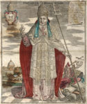 - 1) L'immagine mostra un papa, con lo scettro in una mano e l'altra alzata. Sul suo corpo è riportato l'elenco di tutti i papi dal I al XVII secolo. Sullo sfondo, a sinistra si osserva la cupola di San Pietro, e a destra della figura una pila di parafenali papali : un libro, mitre, un cappello, un incensiere.