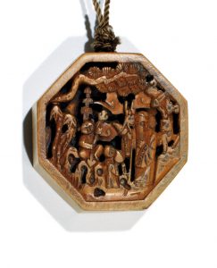 Pendentif en bois naturel représentant Zhoulao recevant les offrandes de deux enfants. Motif calligraphié au revers.