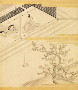 à l'encre et rehauts dorés sur papier, représentant des scènes du Genji Monogatari, sur l'une , un couple dans pavillon derrière des écrans de bambou, un démon les observant. Sur l'autre, couple dans un pavillon. Japon, XVIIe siècle. 24,2 x 21 cm. - 23,8 x 20,8 cm (Encadrées sous verre)