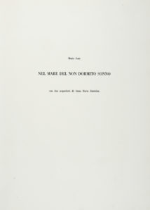 Cartella in folio (mm 705x510) contenente 1 carta di frontespizio, 1 di colophon, 1 con una poesia di Mario Luzi firmata e numerata a matita dall'Autore e 2 acqueforti su velina applicata di Anna Maria Bartolini, ciascuna firmata e numerata a matita in basso ai lati. Es. n. 9/30, uno dei 30 stampati su carta Goya presso la stamperia Bocconcelli di Imola. Cartella editoriale originale con titoli impressi al piatto anteriore.