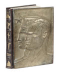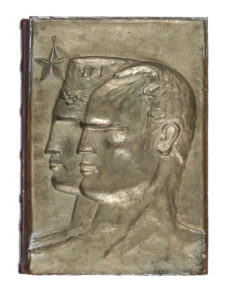 Legatura in pelle con due altorilievi in bronzo dorato montati sui piatti e raffiguranti il primo ritratto di profilo di Mussolini e dell'allegoria dell'Italia e il secondo un cavallo alato che si libra nell'aria con due gladii, allentato il piatto anteriore all'interno. (1)