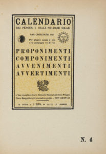 PARIGI Pietro — Calendario dei pensieri e delle pratiche solari [...] Proponimenti, componimenti, avvenimenti, avvertimenti. — Firenze : s.e. s.d. [i.e. 1923-1924]. — 12 numeri in 10 fascicoli in 1 volume in-4° grande (mm 360 x 255).