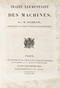 HACHETTE Jean Nicolas Pierre — Traité élémentaire des machines. Paris, Saint-Petersbourg : J. Klostermann fils - 1811. — In-4° (mm 255x195).