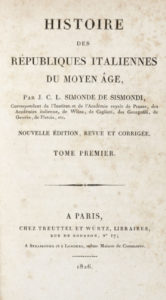 de SISMONDI Jean Charles Léonard Simonde — Histoire des républiques italiennes du moyen âge [...] Tome premier (-seizième).— A Paris : chez Treuttel et Wurts - 1826. — 16 volumi in-8° (mm 204 x 122).