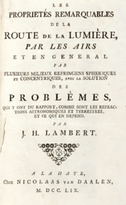 LAMBERT Johann Heinrich — Les proprietés remarquables de la route de la lumière par les airs et en général par plusieurs milieux refringens sphériques et concentriques…— A La Haye : chez Nicolaas van Daalen - 1759. — In-8° (mm 200 x 120).