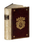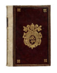 Bella legatura alle armi di Sisto V in mezza pergamena rigida, con piatti in mezza pelle borgogna, fregi e titoli in oro su tassello al dorso a 4 nervi.