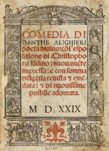ALIGHIERI DANTE — Comedia [...] con l'espositione di Christophoro Landino... — S.l. : s.e. - 1529. (Al colophon:) Stampato in Venetia : per Iacob del Burgofranco pavese. — Ad instantia del nobile messere Lucantonio giunta, fiorentino 1529 a di...