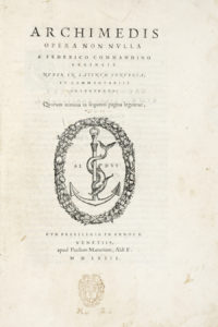 ARCHIMEDES — Opera non nulla à Federico Commandino Vrbinate nuper in Latinum conversa— et commentariis illustrata. — Venetiis : apud Paulum Manutium, Aldi f. - 1558. — 2 parti in 1 volume in-folio (mm 322 x 220).