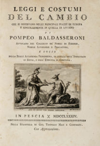 BALDASSERONI Pompeo — Leggi e costumi del cambio che si osservano nelle principali piazze di Europa e singolarmente in quella di Livorno... — In Pescia : Nella Stamperia di Gio. Tommaso Masi e Compagni - 1784. — In-4° (mm 237 x 165).