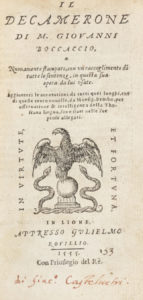 BOCCACCIO Giovanni — Il Decamerone [...] nuovamente stampato con un raccoglimento di tutte le sentenze in questa sua opera da lui usate. — In Lione : appresso Gulielmo Rovillio - 1555. — In-12° (mm 118 x 65).