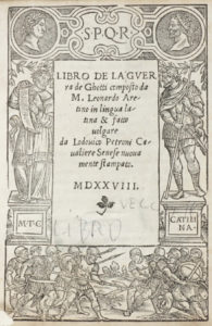 BRUNI Leonardo — Libro de la guerra de Ghotti [...] fatto volgare da Lodovico Petroni... — S.l. : s.e. - 1528 (Al colophon:) In Vinegia : per Nicolo d'Aristotile detto Zoppino da Ferrara - 1528. — In-8° (mm 160 x 105).