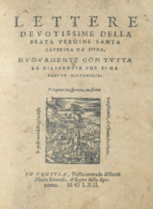 CATERINA DA SIENA — Lettere devotissime [...] nuovamente con tutta la diligentia che si ha potuto ristampate. — In Venetia : nella contrada di santa Maria formosa, al segno della Speranza - 1562. — In-4° (mm 200 x 150).