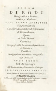 CORONELLI Vincenzo Maria — Isola di Rodi geografica-storica, antica e moderna? coll'altre adiacenti già possedute da caualieri hospitalieri di S. Giovanni di Gerusalemme. — In Venezia : alla libraria della geografia— sopra il ponte di...