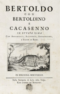 CROCE Giulio Cesare — Bertoldo con Bertoldino e Cacasenno in ottava rima con, argomenti, allegorie, annotazioni e figure in rame. — Bologna : nella Stamperia di Lelio dalla Volpe - 1736. — In-4° (mm 290 x 210).
