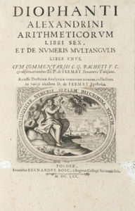 DIOPHANTUS Alexandrinus — Arithmeticorum libri sex et De numeris multangulis liber unus. — Tolosae : excudebat Bernardus Bosc è regione Collegij Societatis Iesu— 1670. — In-folio (mm 322 x 212).