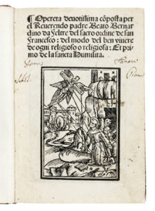 FELTRE Bernardino (da) — Opereta devotissima [...] del modo del ben vivere de ogni religioso o religiosa…— (Al colophon:) [Venezia] : per el Benali - s.d. [i.e. 1500-1525 ca.]. — In-8° (mm 157 x 98).