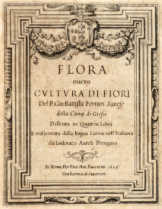 FERRARI Giovanni Battista — Flora overo cultura di fiori [...] distinta in quattro libri e trasportata dalla lingua latina all'italiana da Lodovico Aureli... — In Roma : per Pier'Antonio Facciotti - 1638. — In-4° (mm 224 x 165).
