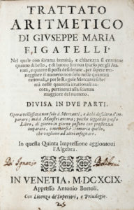 FIGATELLI Giuseppe Maria — Trattato aritmetico [...] nel quale con somma brevità, e chiarezza si contiene [...] quanto si possa desiderare per sapere maneggiare il numero... — In Venetia : appresso Antonio Bortoli - 1699. — In-8° (mm 155 x 105).