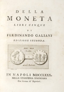 GALIANI Ferdinando — Della moneta libri cinque. — Edizione seconda. In Napoli : nella Stamperia Simoniana - 1780. — In-4° (mm 228 x 165).