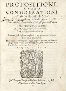 GUICCIARDINI Francesco — Propositioni, overo Considerationi in materia di cose di Stato [...] Nelle quali si contengono, leggi, regole, precetti e sentenze molto utili... — In Vinegia : presso Altobello Salicato - 1588. — In-4° (mm 215 x 160).