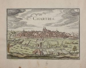 Suite de 18 planches gravées à l'eau-forte et anciennement aquarellées avec vues à vol d'oiseau de Chartres, Châteaurenard, Corbeil, Étampes, Montargis.