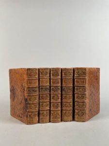 La Haye, Pierre Gosse, 1744 ; 5 forts volumes petits in-8, veau marbré de l'époque, dos à nerfs ornés de motifs dorés, tache brune au second plat d'une reliure.