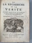 [MALEBRANCHE Nicolas]. De la recherche de la Vérité. Où l'on traitte de la nature de l'esprit de l'homme & de l'usage qu'il en doit faire pour éviter les erreurs dans les sciences. Paris, André Pralard, 1678 ; in-4, veau fauve de l'époque, dos à nerfs orné de motifs dorés.