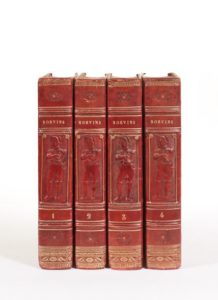 NORVINS Jacques Marquet de Montbreton de. Histoire de Napoléon. Paris, Ambroise Dupont et Cie, 1827 ; 4 forts volumes in-8, reliures de l'époque demi-veau rouge à petits coins, dos à quatre nerfs ornés de motifs dorés et à froid avec portrait de Napoléon en pied repoussé, tranches à décor polychrome.