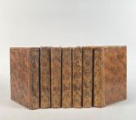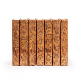 Édition ornée d'un portrait de Racine et de 12 figures de Hubert François Gravelot. Artiste-décorateur qui a exporté le goût français à Londres, Gravelot a également, ici, composé le décor doré au dos des sept reliures. Fait peut-être unique dans l'histoire ancienne du livre, il a décoré les volumes à l'intérieur et à l'extérieur. Deux coiffes écorchées.