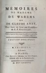 WARENS Louise-Éléonore de. Mémoires de Madame de Warens et de Claude Anet, pour servir de Suite aux Confessions de J.-J. Rousseau. Chambéry ; Paris, Leroy, 1786 ; pet. in-8 de [2] ff., xvj et 237 p., broché, couverture rose.
