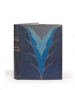 ALAIN-FOURNIER. Le Grand Meaulnes. Paris, Émile-Paul frères, 1930 ; fort vol. grand in-4, reliure ancienne maroquin bleu nuit, sur les plats grand motif central mosaïqué de deux tons de bleu sertis de filets dorés, terminé dans le haut en un triangle insérant 48 filets dorés, dos lisse, doublures bord à bord de maroquin turquoise, gardes de soie moirée saphir, ébarbé, tranches dorées, chemise et étui (Marot-Rodde).