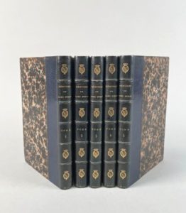 BYRON George Gordon, Lord. Mémoires, publiés par Thomas Moore. Paris, A. Mesnier, 1830 ; 5 vol. in-8, demi-maroquin bleu du XIXe siècle, armes répétées dorées au dos, têtes dorées.