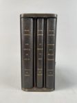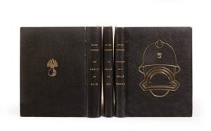 DORGELÈS Roland. Les Croix de bois. - La Boule de Gui. - Le Cabaret de la Belle femme. Paris, La Banderole (puis) Émile-Paul frères, 1921-1924 ; 3 ouvrages en 3 vol. pet. in-4, reliures anciennes maroquin noir, grand casque doré sur chaque premier plat, vase ardent sur le second, dos lisses, doublures et gardes de soie moirée orange, cadre intérieur ornementé de même maroquin, tranches dorées sur témoins, couvertures et dos, chemises et étuis (L. Lévêque. - R. Mondange).