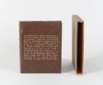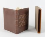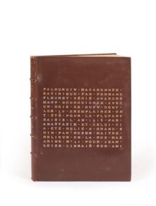 FLEURET Fernand. Falourdin. Macaronée satirique dédiée à André Mary, bourguignon, par Fernand Fleuret Delphes, au Trépied pythien, l'an IIIe du Délire de Lamachers, [Librairie d'Action d'Art de la ghilde « Les Forgerons », 1917] ; in-12 carré, reliure ancienne veau brun, sur le plat supérieur inscription en lettres capitales dorées et argentées en forme de rectangle, dos à nerfs, doublures de box bleu ciel, tranches dorées sur témoins, couverture illustrée et dos, étui (Huser).
