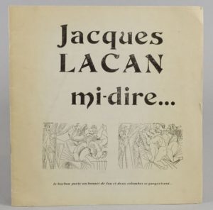LACAN Jacques. Mi-dire... S.l.n.d (Paris, 1974) ; fascicule reprographié in-8 oblong broché, couverture imprimée illustrée, [20] pages, couverture illustrée.