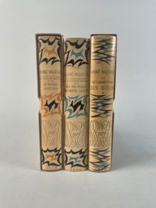 MALRAUX André. Réunion de trois ouvrages de psychologie de l'art en cartonnages Paul Bonet. Paris, NRF, 1954-1957 ; ensemble 3 forts vol. in-4, cartonnages dorés et polychromes de l'éditeur, deux étuis, un dos en partie décollé.