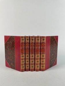 RABELAIS François. Les cinq livres de F. Rabelais [Pantagruel. - Gargantua], publiées avec des variantes et un glossaire par P. Chéron. Paris, Jouaust, 1876-1877 ; 5 vol. in-12, reliures de l'époque demi-maroquin rouge à coins, filets dorés, dos à nerfs ornés de motifs dorés et mosaïqués, têtes dorées (Marmin).